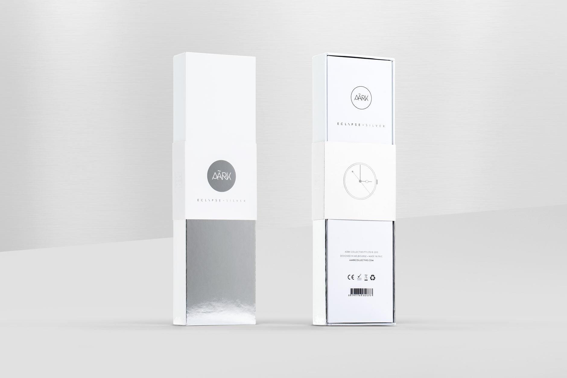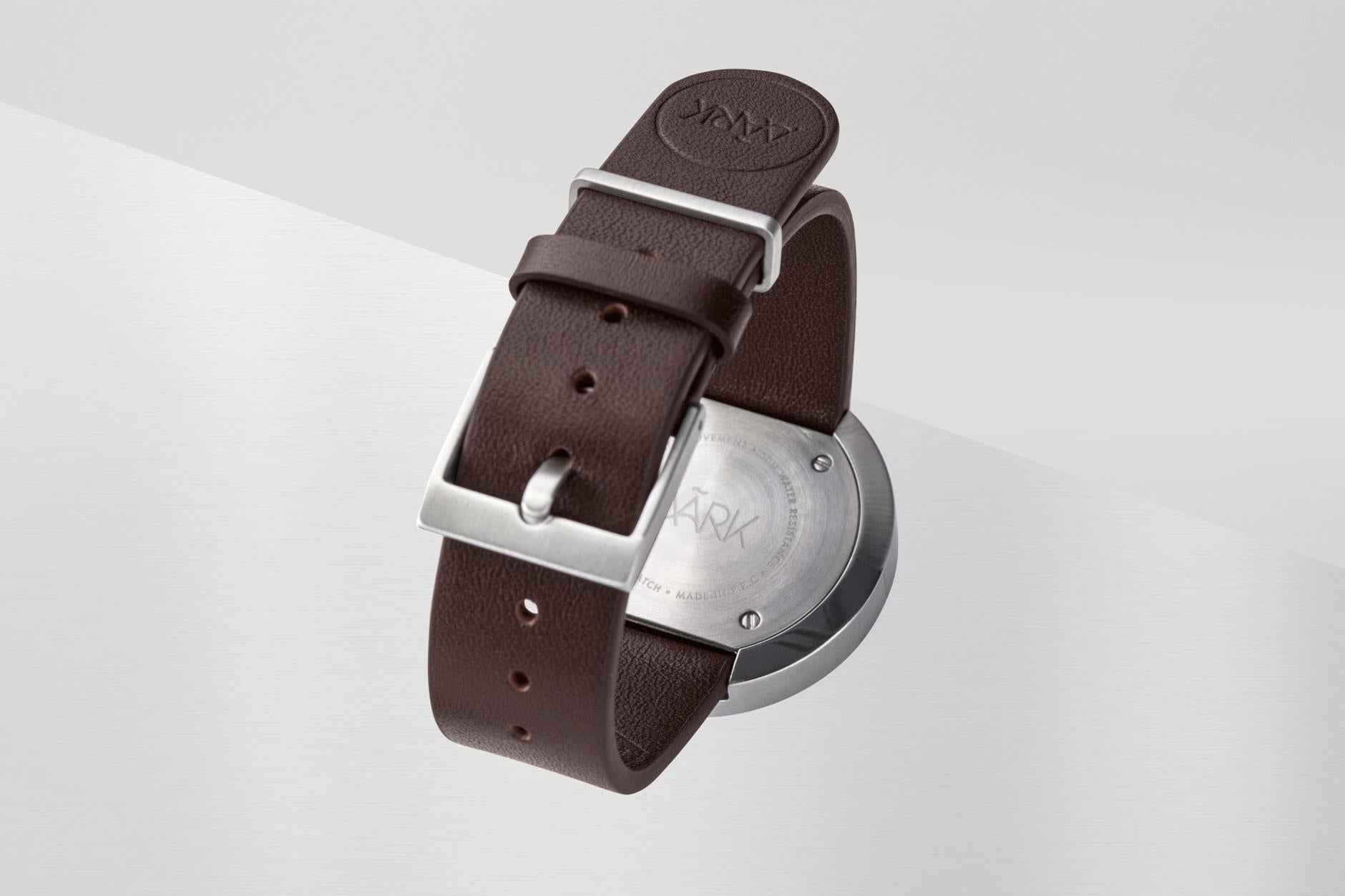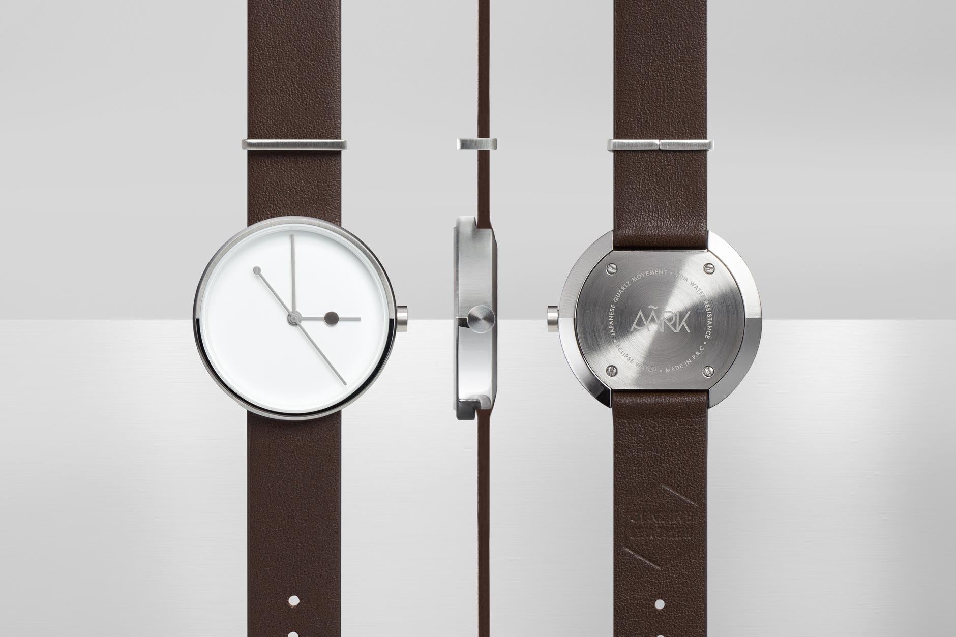 The Eclipse explores AÃRK’s relationship with time. Day and night are referenced in the dual-tone plating—hand-dipped in gold—while the simple, contrasting dial evokes the moon’s movement in relation to the earth and the sun.