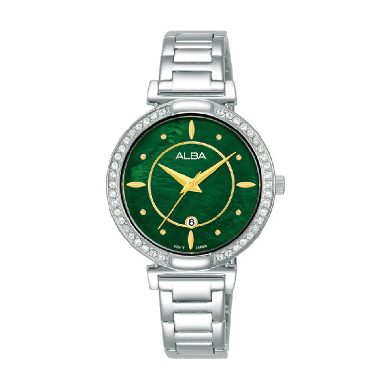 The Alba AH7BF3X is an elegant and functional timepiece designed specifically for women who appreciate both style and practicality. Featuring a 31mm stainless steel case and a stunning green dial, this watch combines sophistication with durability. The analog display offers classic charm, while the quartz movement ensures precise timekeeping. With a silver stainless steel bracelet and a clasp closure, it’s perfect for daily wear. Water-resistant and designed to withstand the rigors of everyday life, this watch is an ideal choice for the modern woman.