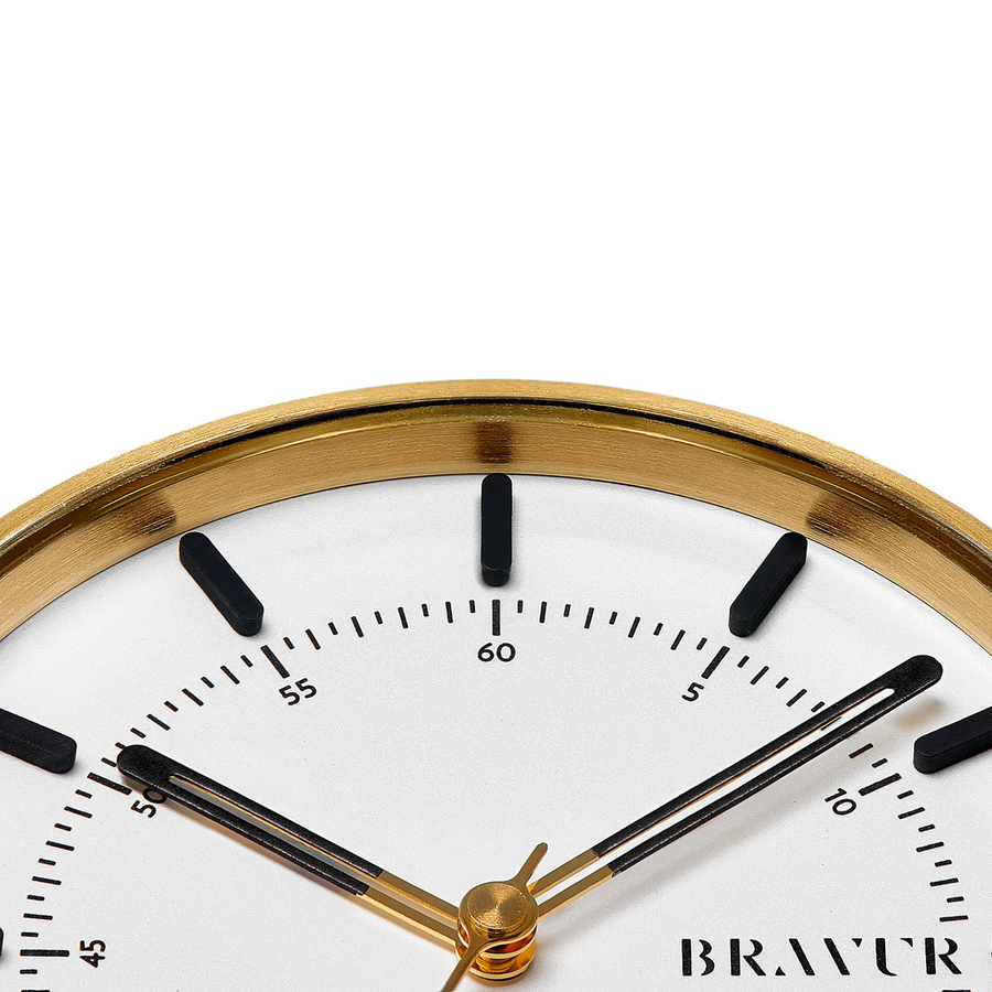 The BW002G in gold plated is a distinct expression of a luxurious timepiece with well balanced details. The design takes it starting point in a cylindrical shape, with a lugless case and a thin bezel surrounding the domed sapphire crystal. Every index is meticulously placed on the dial by hand. Applied hour indices with corresponding shape of the hands give the watch a pared-down elegance.