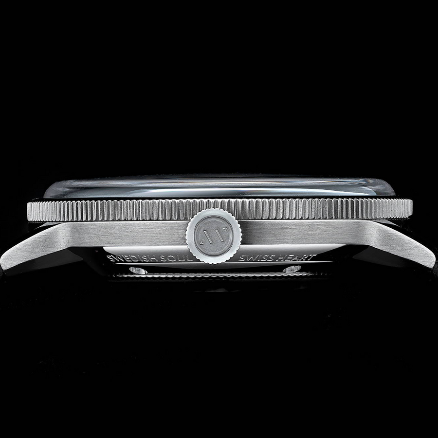 The first mechanical watch by Bravur with a Swiss-made movement, the BW003 is hand-built by experienced watchmaker in the small coastal town of Båstad. This highly refined and elegant timepiece has a Solitär case made in Swedish stainless steel. Swedish steel has a reputation for being the highest quality in the world, and the steel used by Bravur is made by Sandvik, a company dating back to 1862. The distinctive features of the case are the fluted bezel side, and another ring of fluting on the case back, around the sapphire glass window.