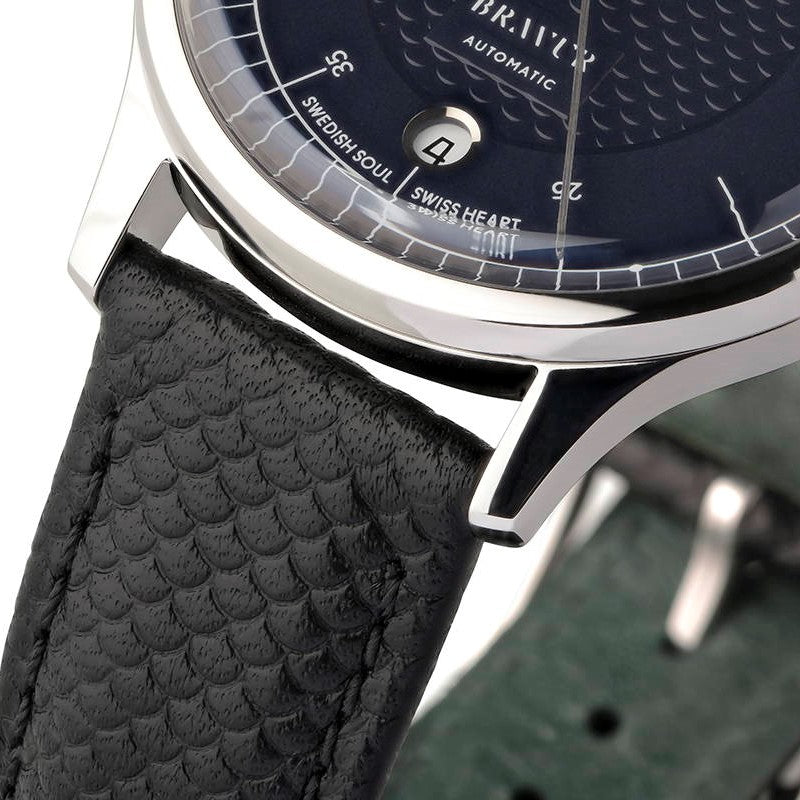 The minimalist aesthetic is conveyed through the contemporary Bauhaus vibe of the delineated minute track, while the dial centre is recessed in a delightful fish-scale pattern that nods to the Scandinavian coastline and maritime traditions. The scales are embossed into the dial meaning they will catch light and change appearance depending on the surroundings.
