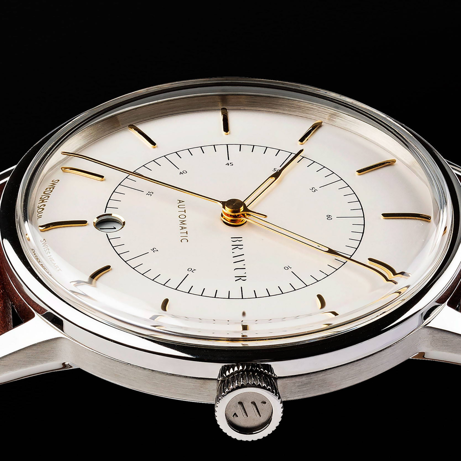 The Scandinavia model is a tribute to Bravur's heritage and the Scandinavian design movement; a minimalist timepiece with meticulous crafted detailing. The Scandinavia in Sparkling White takes a slightly metallic white surface and combines it with gold markers and hands for restrained decadence. Perfectly proportioned, its skeletonized hands are slightly curved at the ends, so as to match the dial curvature, and long, thin applied markers that cascade down into the shadows where the dial meets the inside of the case.