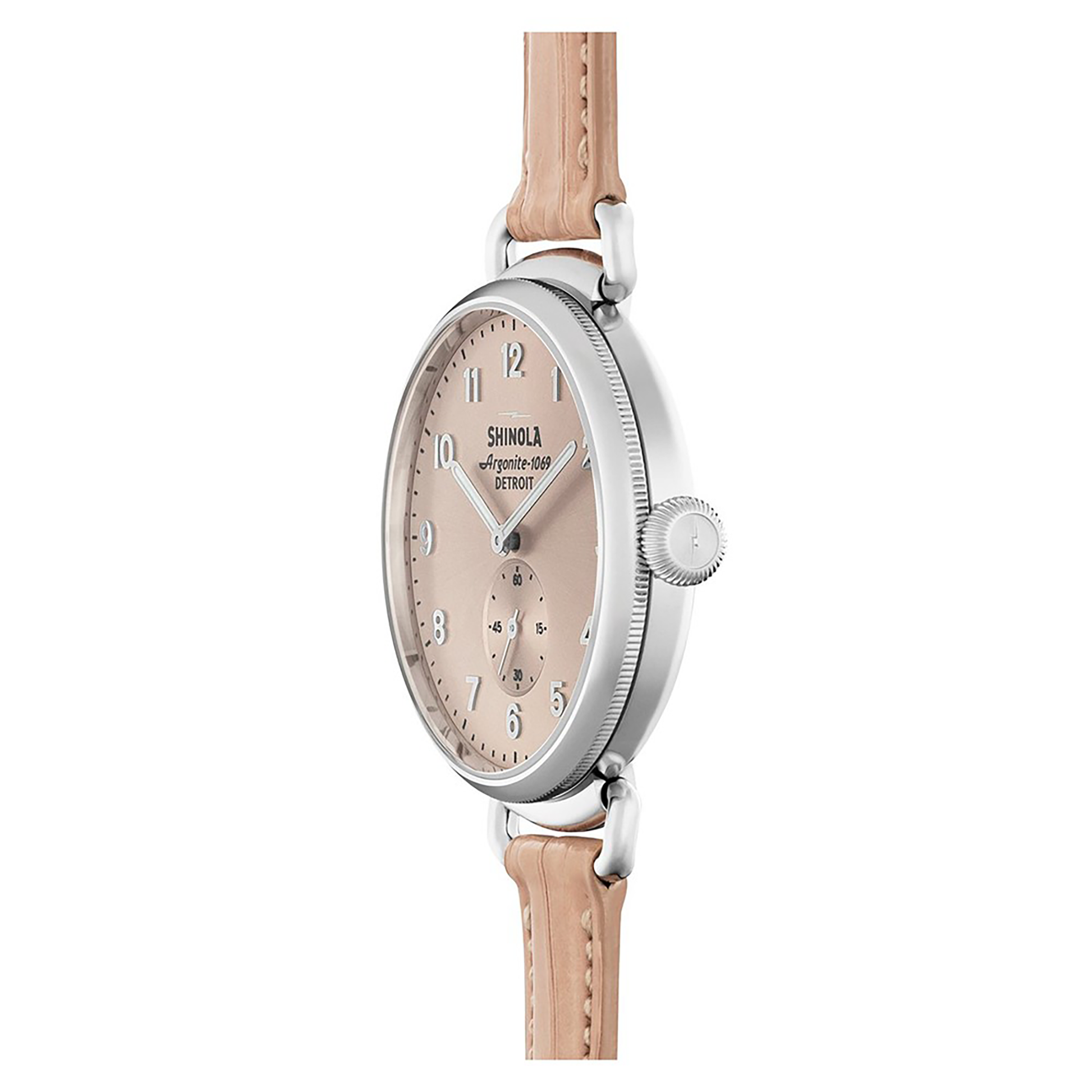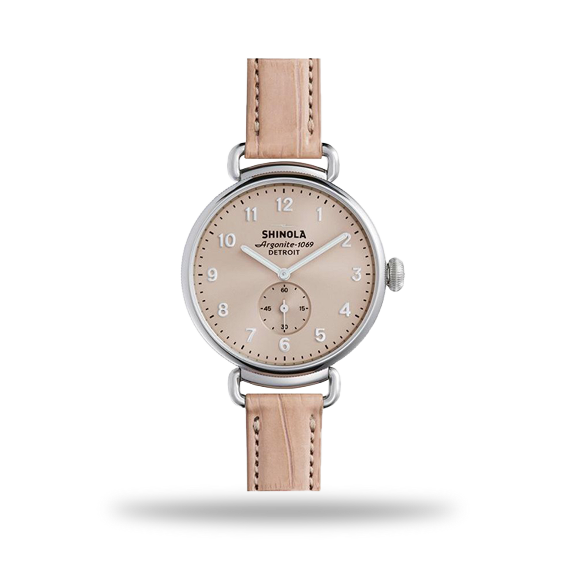 Inspired by postmodern architecture, The Canfield is Shinola's first watch built using a top loaded case construction for a larger face and clearer view showcasing a refined minute track and slim, diamond-cut hands that represent a new era of imagination and industry in Detroit. This timepiece includes signature coin edge detail on the case, wire lugs and swing lug construction on a slim nude pink alligator leather strap with a vintage ardillon buckle.