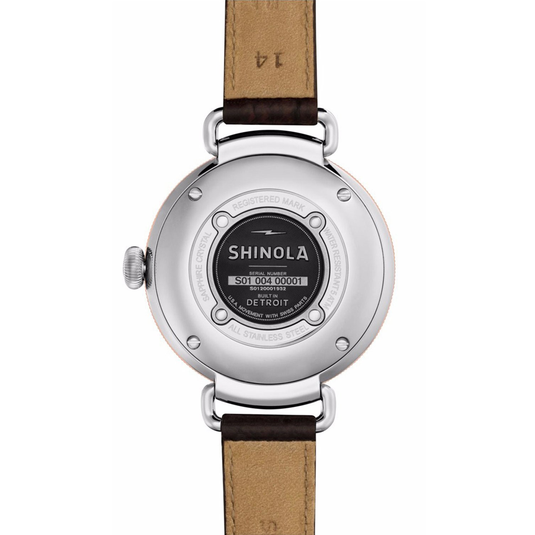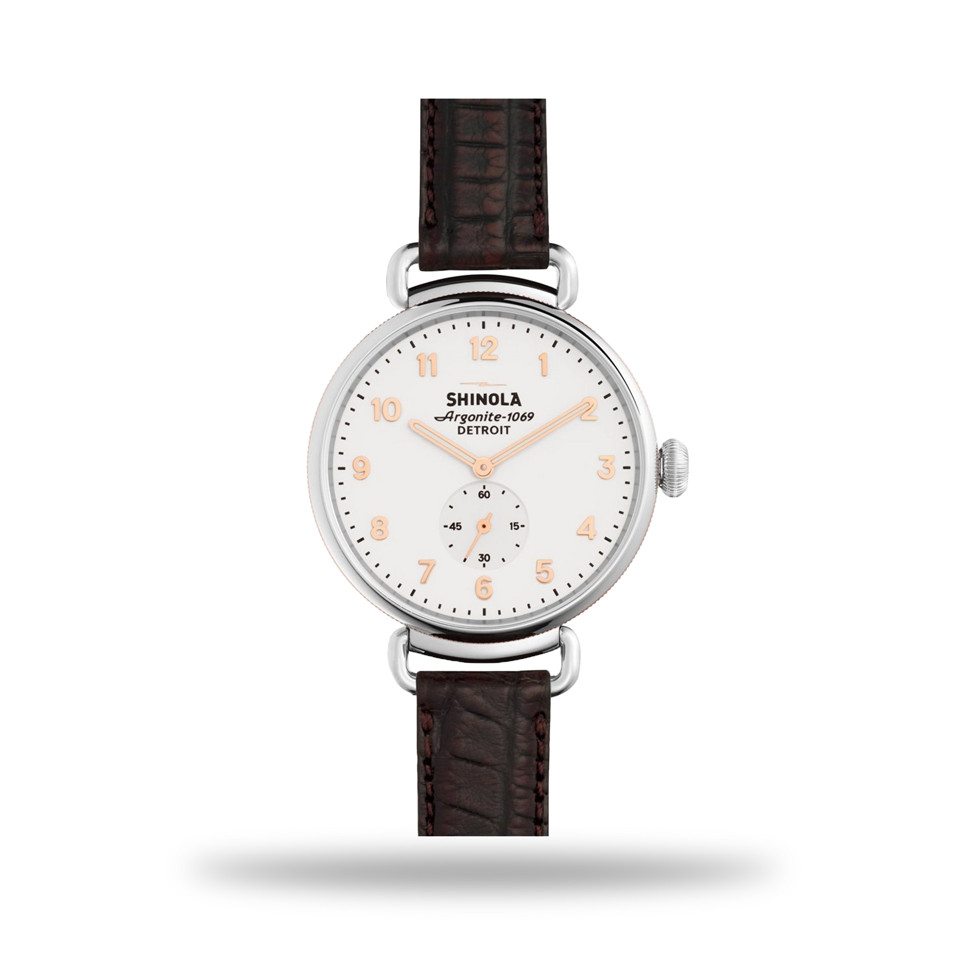 Inspired by postmodern architecture, The Canfield is Shinola's first watch built using a top loaded case construction for a larger face and clearer view showcasing a refined minute track and slim, diamond-cut hands that represent a new era of imagination and industry in Detroit. This timepiece includes signature coin edge detail on the case, wire lugs and swing lug construction on a slim nude alligator leather strap with a vintage ardillon buckle.
