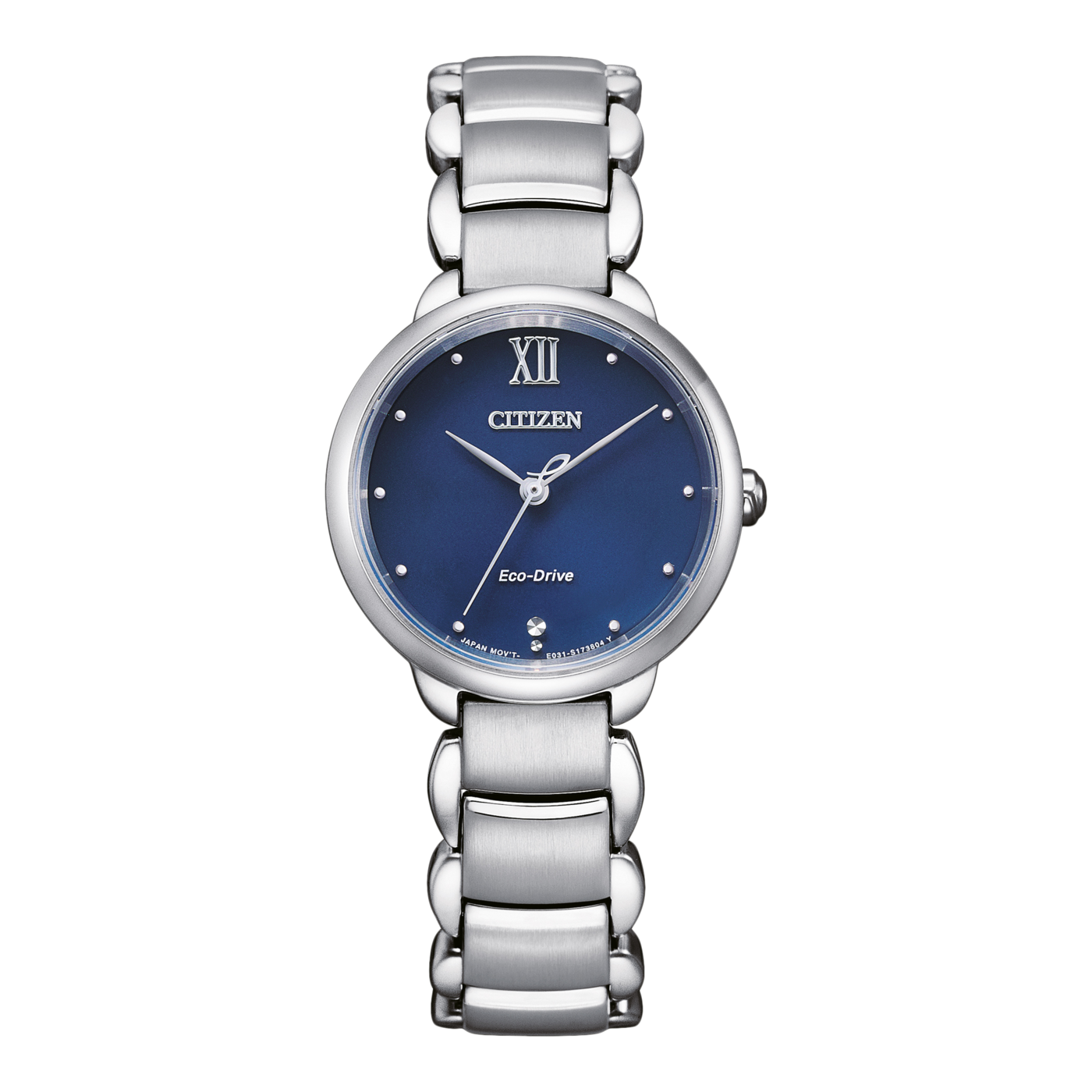 The CITIZEN EM0920-86L is a stylish women’s watch featuring a striking blue dial with a sophisticated combination of dot and Roman numeral indices. Powered by Eco-Drive technology, it offers reliable, solar-powered quartz movement with a long power reserve of 180 days. The elegant stainless steel case and bracelet, along with scratch-resistant sapphire glass, make this watch perfect for everyday wear and special occasions.