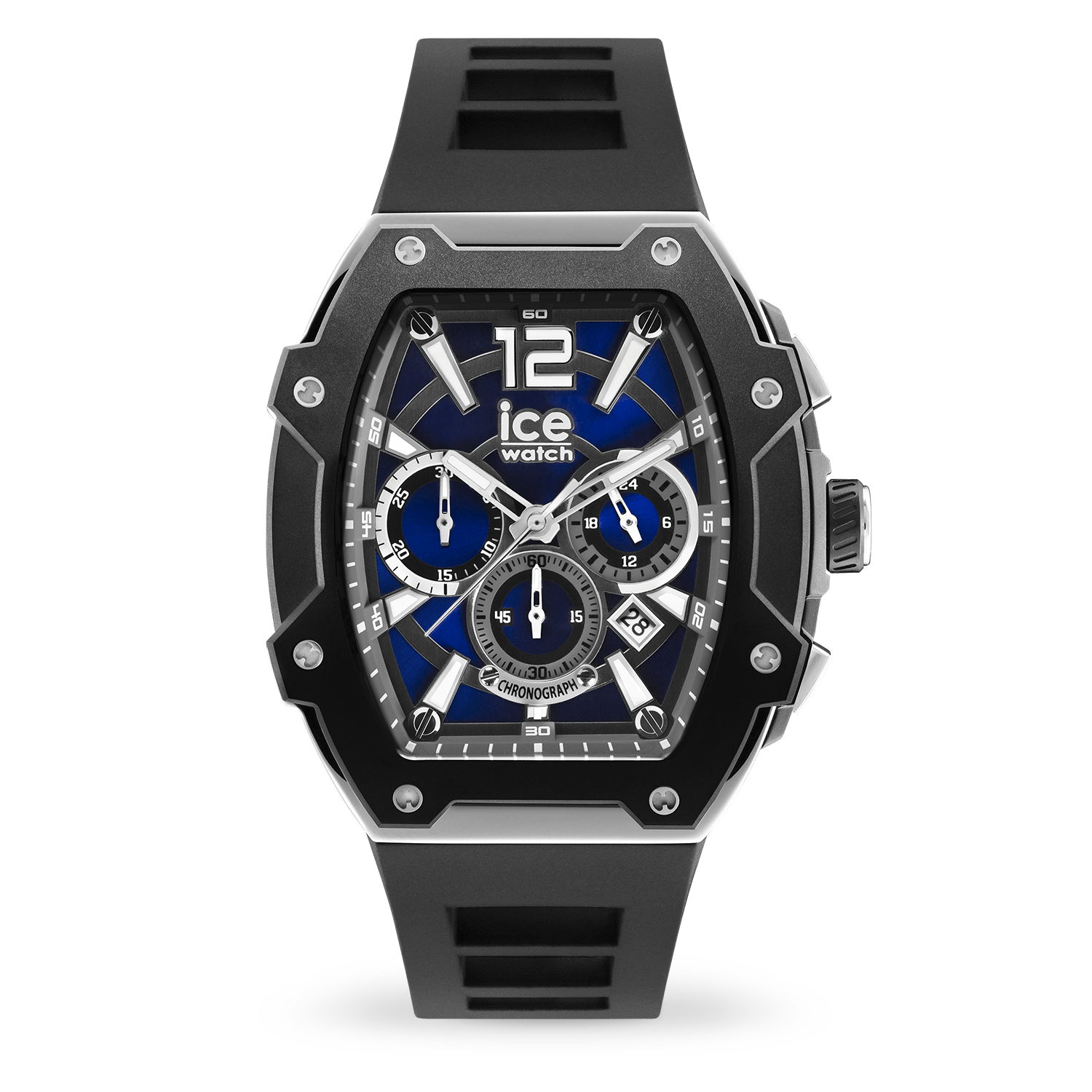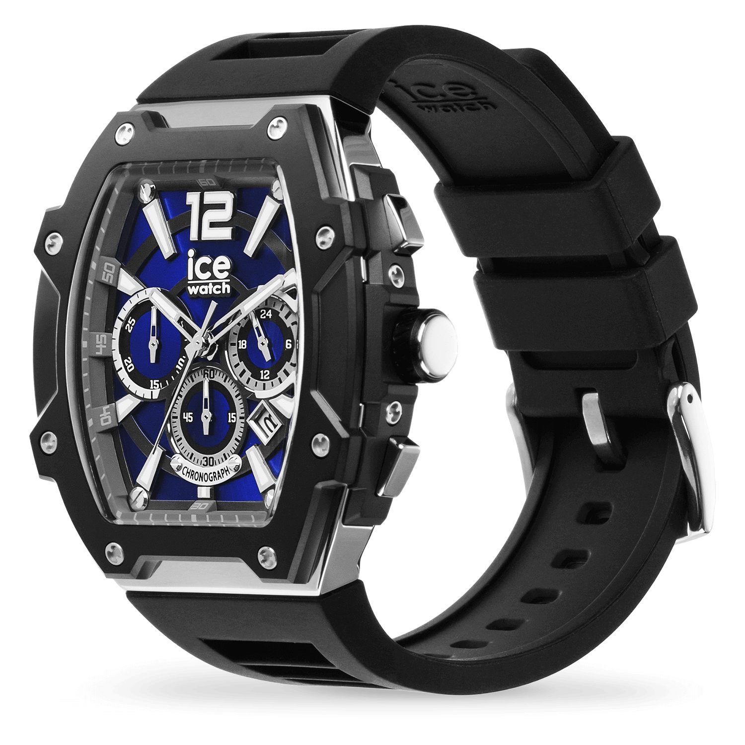 With its bold design and silver steel tonneau case, the ICE boliday - Black blue silver steel is designed for men who don't shy away from any challenge. The silver dial and chic and elegant matte black bezel highlight a complex chronograph movement, where every mechanical detail is revealed before your eyes. The textured black silicone strap makes this watch the ideal companion for an active life, while ensuring inimitable style. Waterproof to 10 ATM, this watch will accompany you everywhere, all the time!