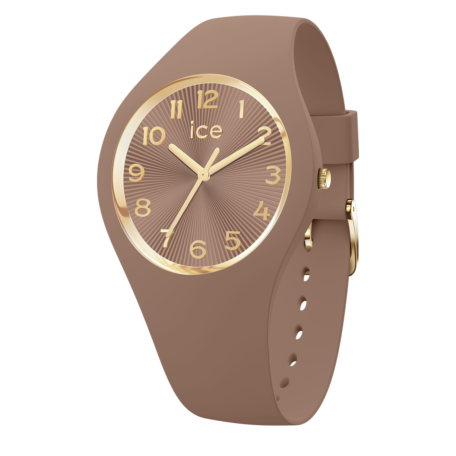 Minimalist elegance... Chic and uncluttered, the ICE champagne - mocha has a timeless look with its warm tones enhanced by gold details: bezel, hands, numerals. A fashion must-have for your dressing room, a real jewel!