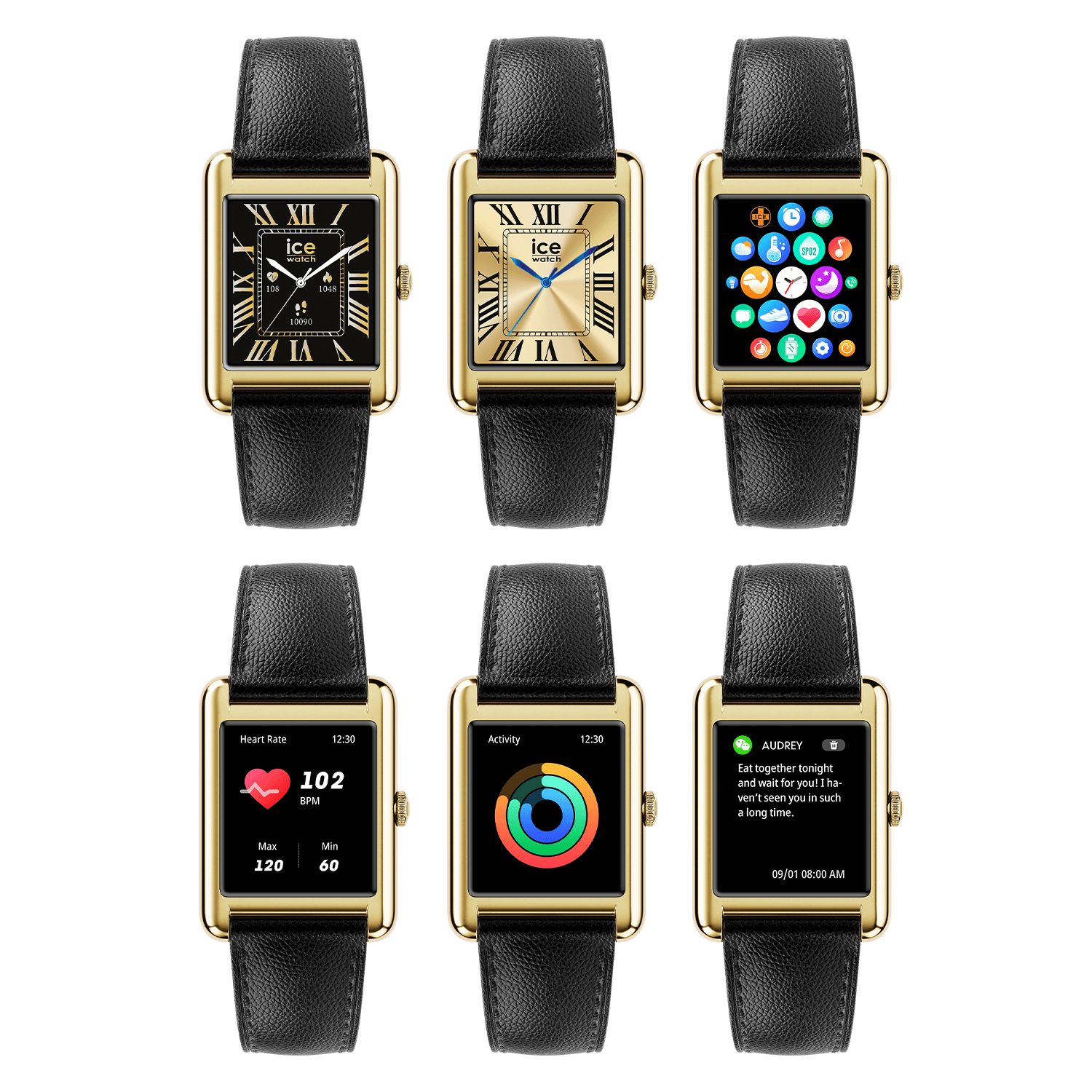 This stylish smartwatch features a textured black grained leather strap paired with a gold-plated rectangular case for a refined, luxurious look. The vibrant 1.41″ AMOLED display offers superb clarity and brightness. With Bluetooth calling, health tracking, sports modes, and customizable watch faces, it’s designed to elevate your everyday lifestyle while keeping you effortlessly connected.